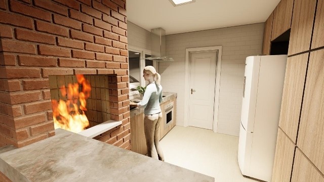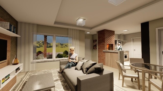 * Cozinha com churrasqueira integrada à sala de estar e jantar