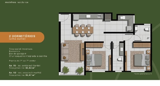 Lançamento - Moinhos Residence, 2 Dormitórios (1 suíte), Sala Estar, Cozinha/Área de Serviços, Banheiro Social, Sacada, 1 Box de Estacionamento.
